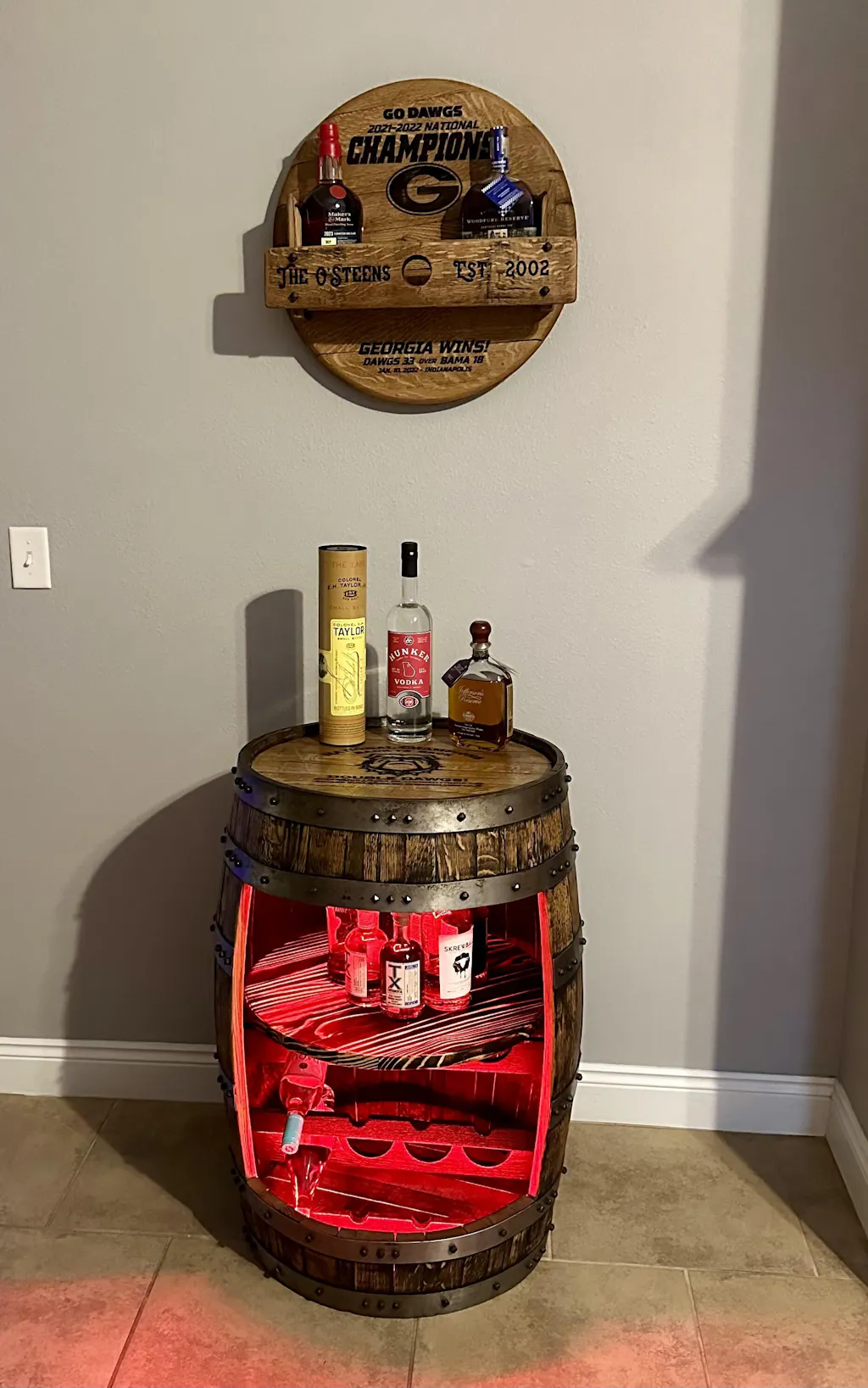 Yes, absolutely. We offer stain selections, hardware upgrades, and lighting enhancements, including LED features with remote control. If you’d like a personalized touch, we can also laser your barrel head with custom artwork or text. During our consultation, we’ll go over every detail so your cabinet reflects your exact vision.