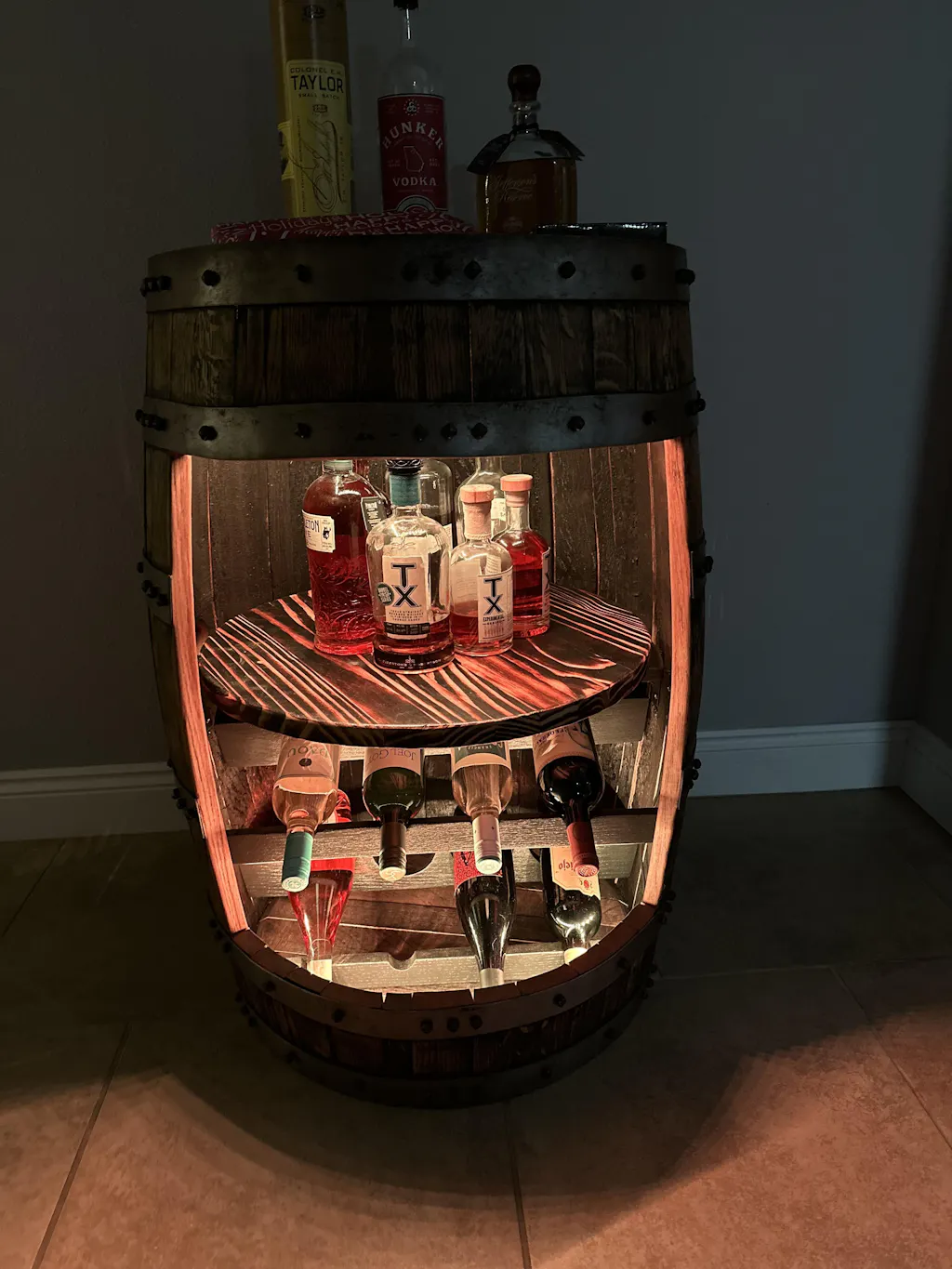 - This unique barrel cabinet is for the homes of our clients that routinely enjoy a nice mixture of wine and spirits. The "Blended" barrel cabinet includes our SIGNATURE BLACKSMITH BOLTS securing the barrel hoops on the exterior of the barrel. It also includes a LAZY SUSAN shelf in the middle of the barrel and LED LIGHTS WITH REMOTE CONTROL. Most importantly, we add our CUSTOM HANDMADE OAK WINE RACKS underneath the middle lazy susan. (Order = "Blended" for $1,650)