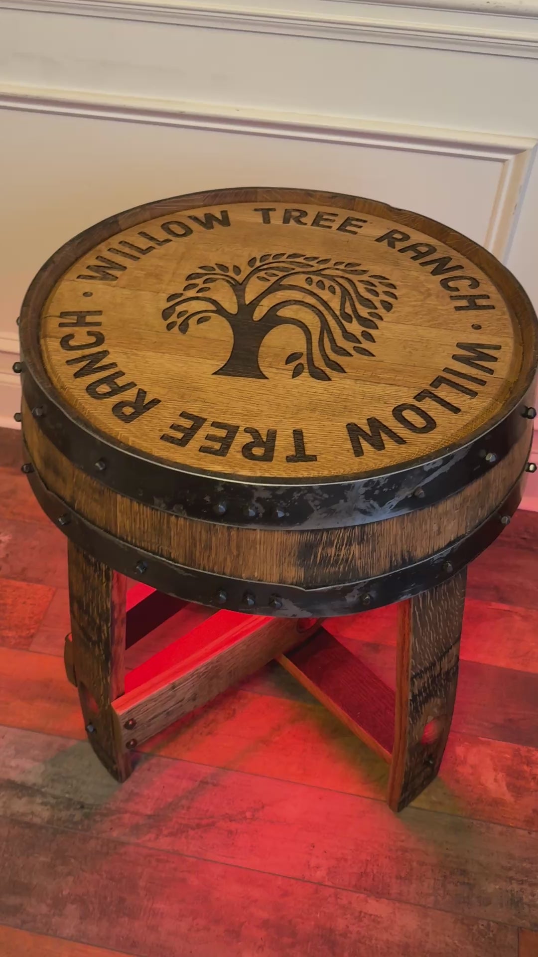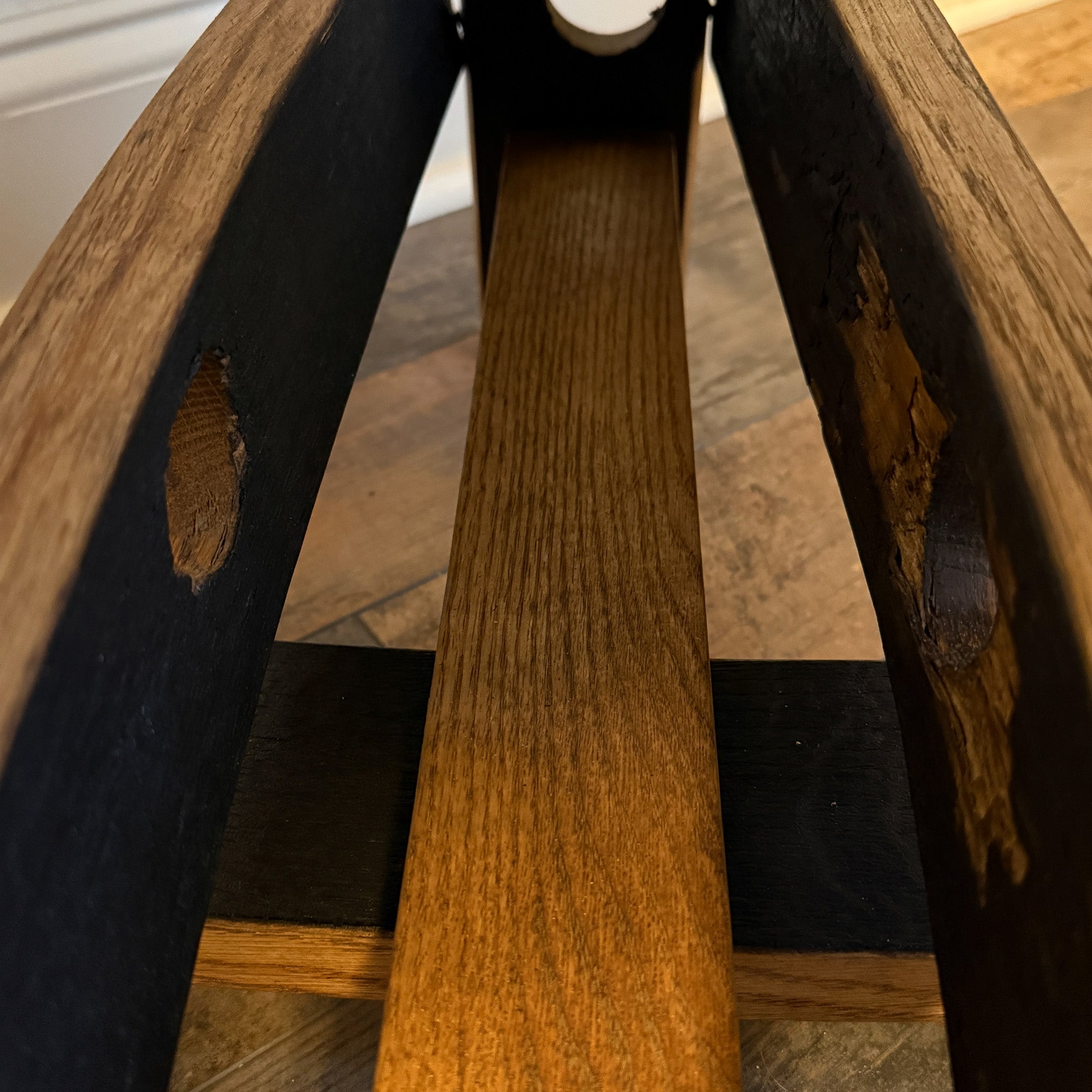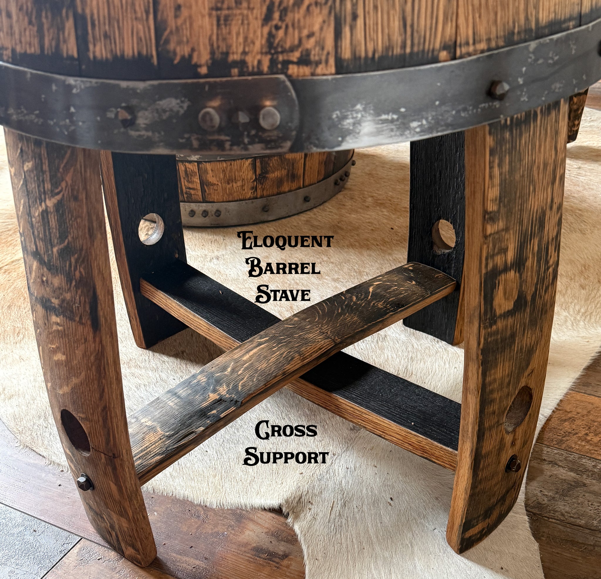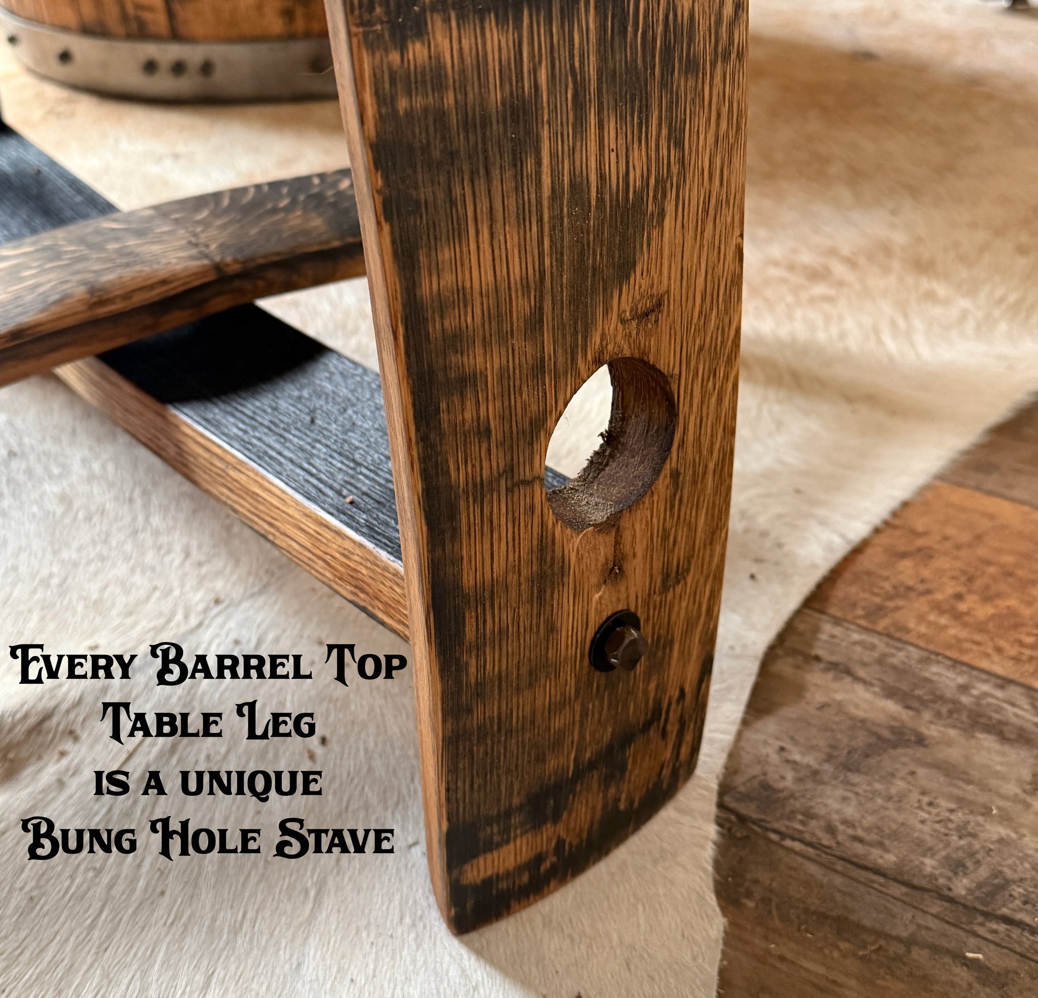 Authentic Reclaimed Material: Every table head is unique, showcasing the individual history of the whiskey barrel it came from. Each leg is crafted from the coveted bunghole stave, adding to the one-of-a-kind nature of this table. Bourbon barrels only have ONE bunghole stave each. The distinctive markings from whiskey seepage and distillery scuffs are highlighted by our special Whiskey Oil, making every imperfection pop beautifully!