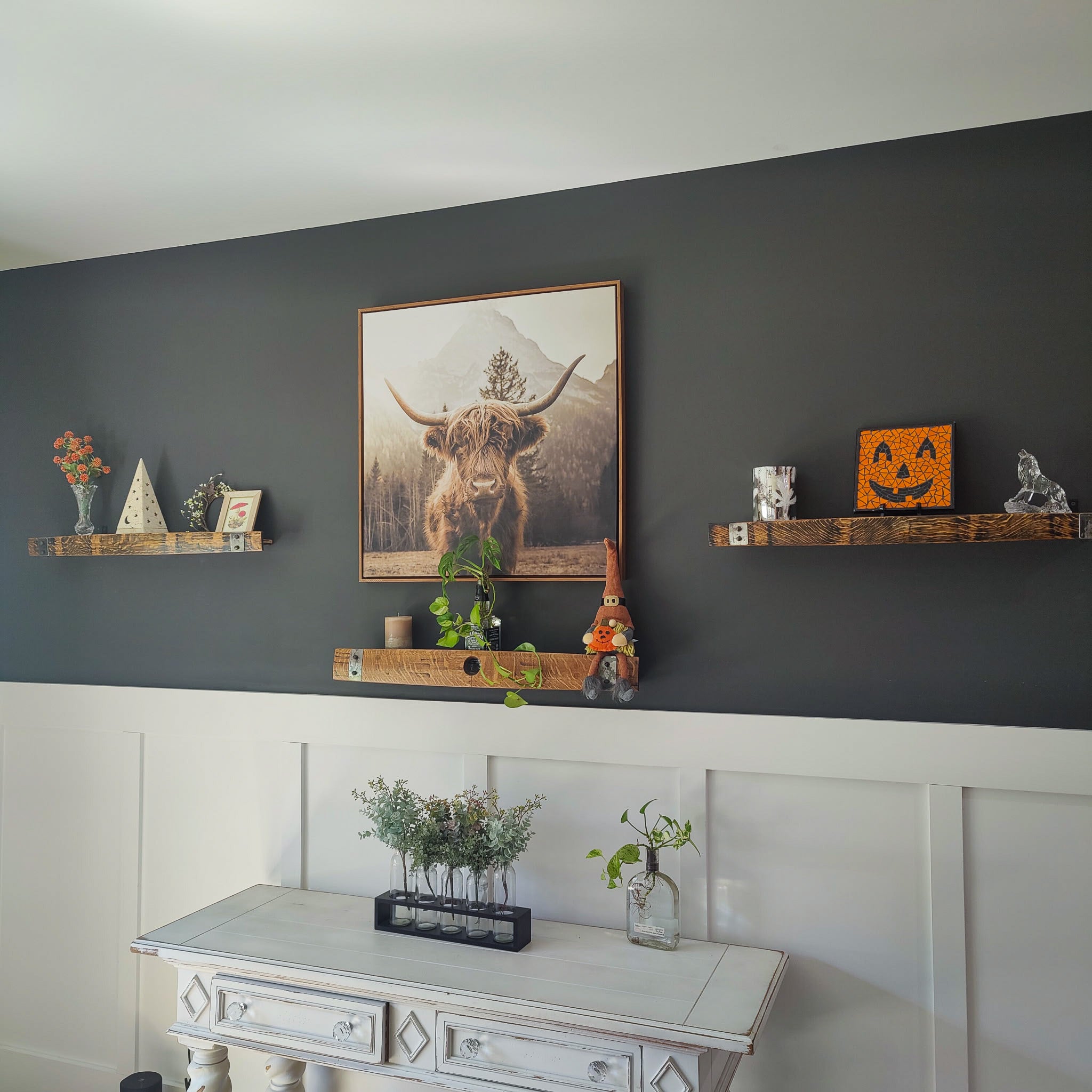 Unlike other floating shelves on the market, our design features our SIGNATURE BLACKSMITH BOLTS and refined details. We sand every corner and edge of the barrel stave by hand to ensure a stylish, rounded finish. Additionally, we polish and smooth the barrel hoops, eliminating sharp corners. These meticulous details, combined with our unique blacksmith bolts, make our floating shelf a beautifully refined addition to your interiors. All mounting hardware and instructions are included!