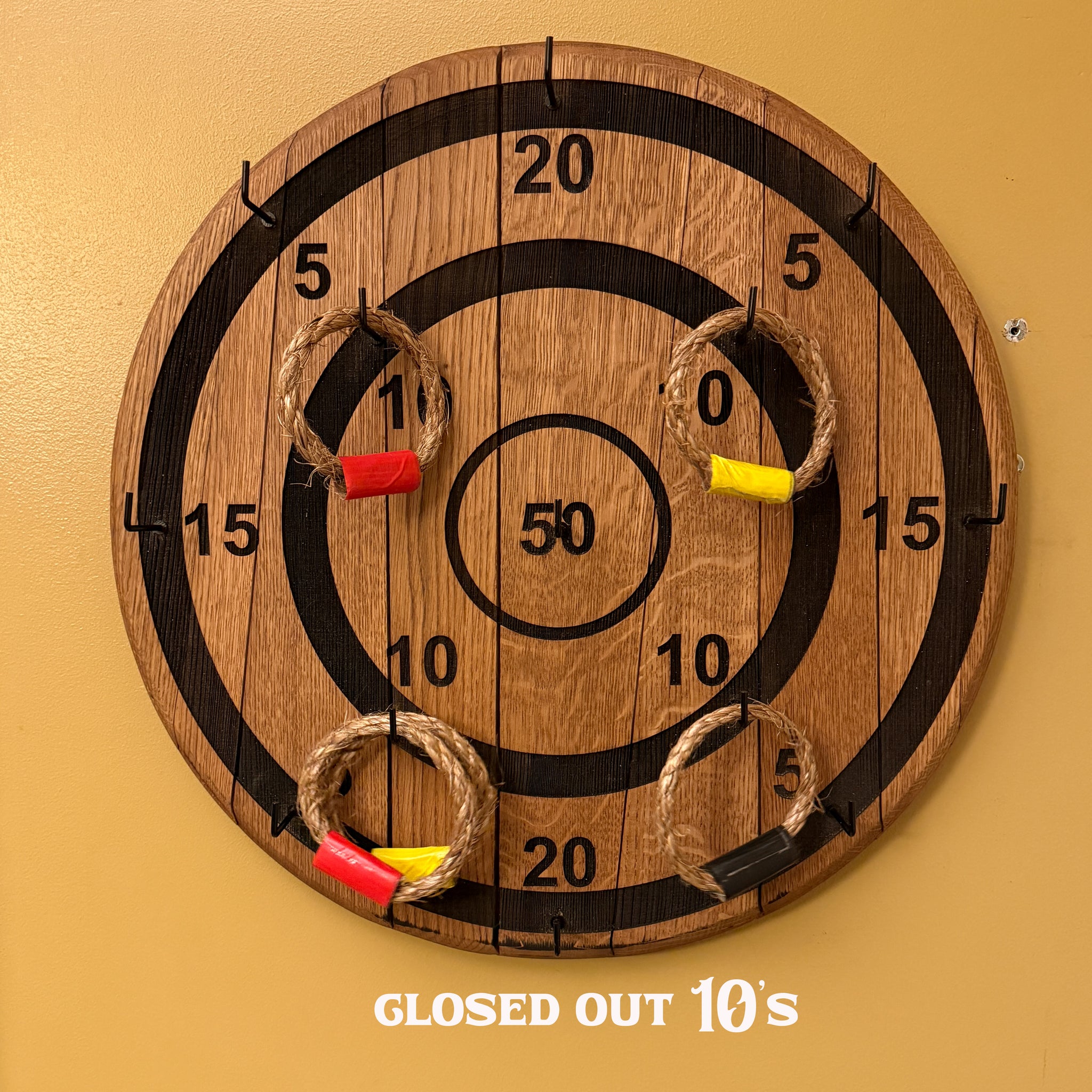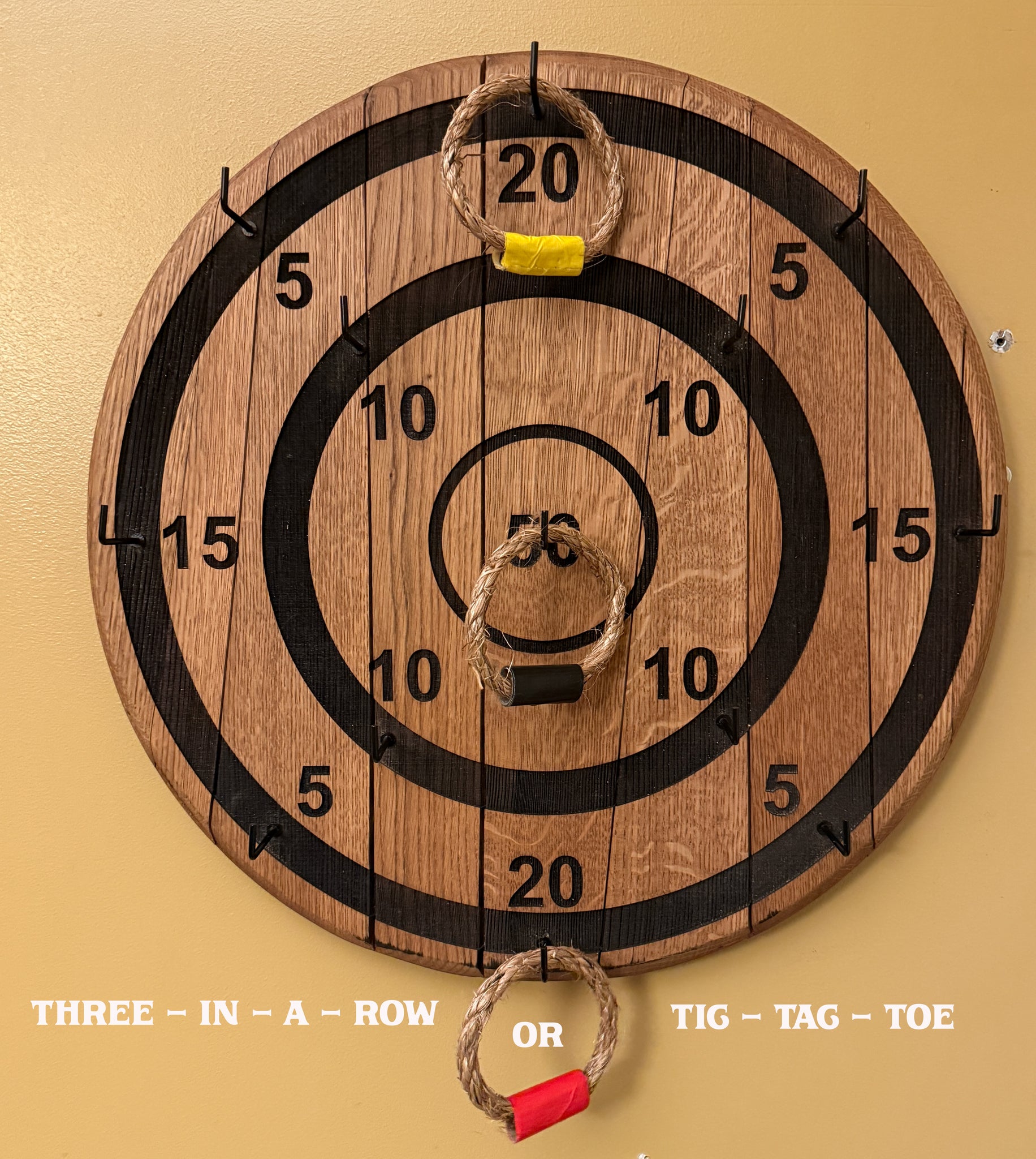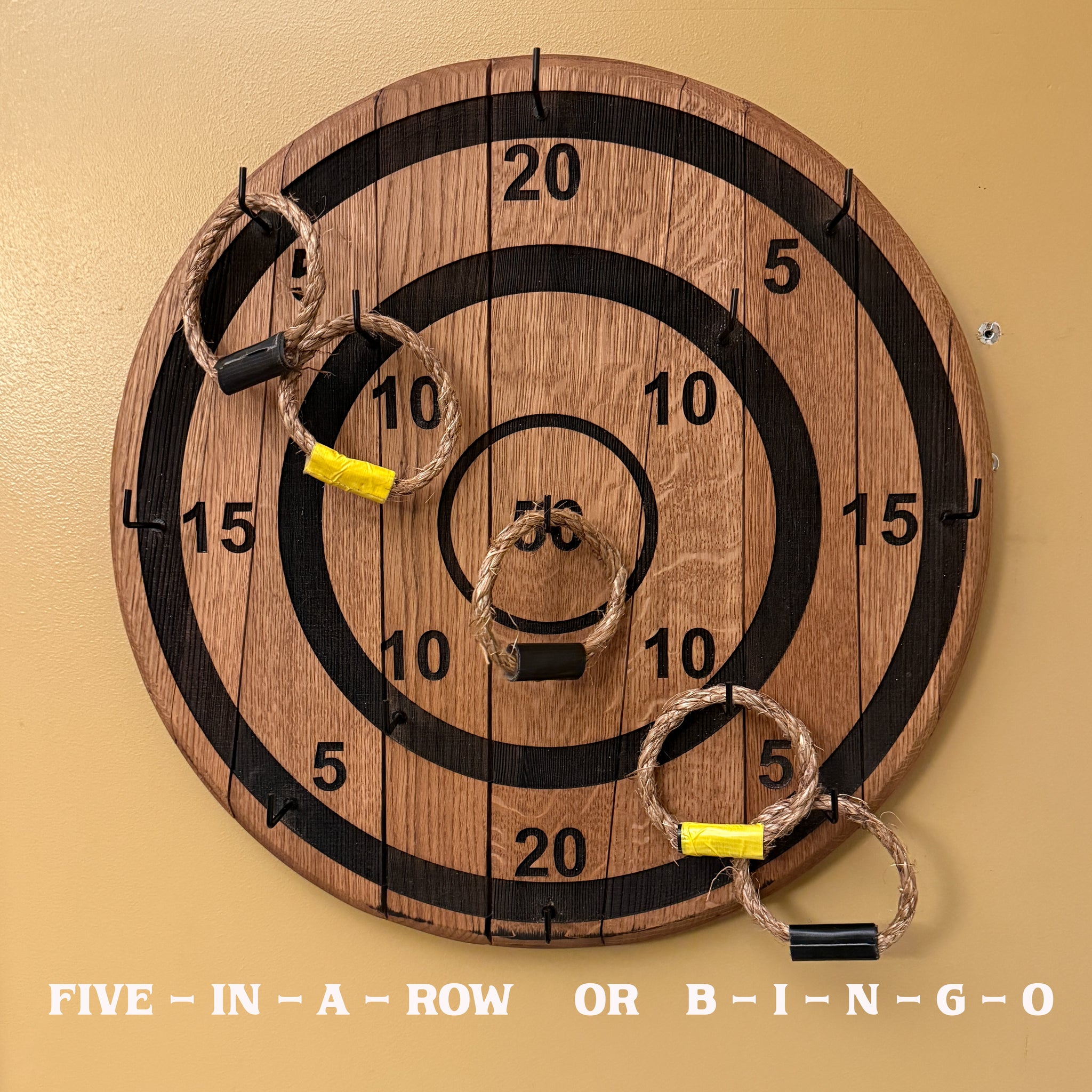 Professional grade Ring Toss game made from an authentic whiskey barrel lid. The numbers and rings are deeply lasered into the American Oak barrel lid. The 2" hooks by each number are easy to hook that allows fun for all ages. Tons of game alternatives available. The barrel lid is professional kiln dried to remove moisture and will allow this game to be passed on for generations. The actual rings are thick rope with sturdy duck tape closure.