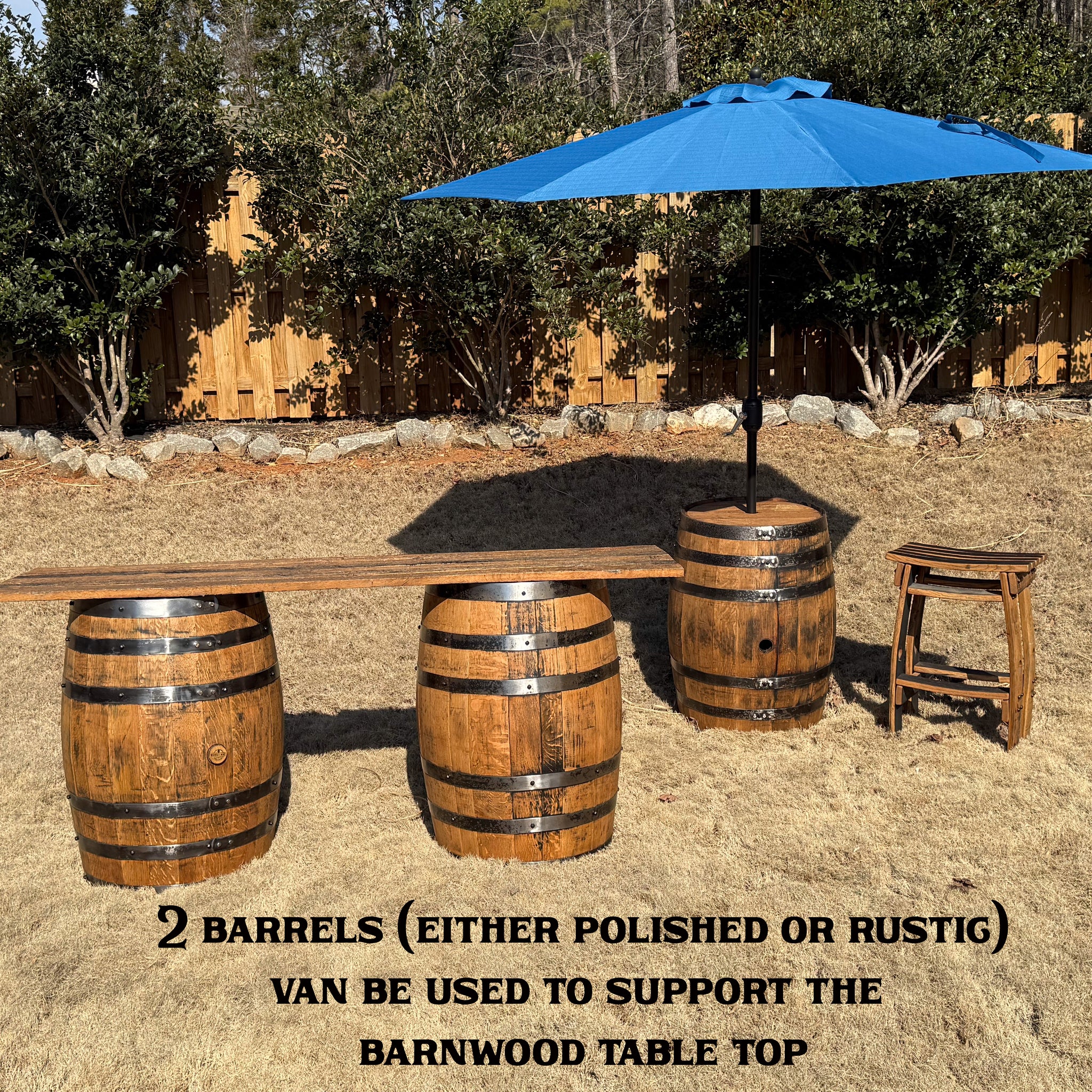 The barrel table set includes two barrels & an authentic Georgia barn wood table top. The rustic barrel table set is $100 for a 1 - 4 day rental. The polished barrel table set is $125 for a 1 - 4 day rental. For rentals longer than 4 days, an additional $25/day is required for the table set. All rental sales are CASH ONLY paid at pick up or before delivery.