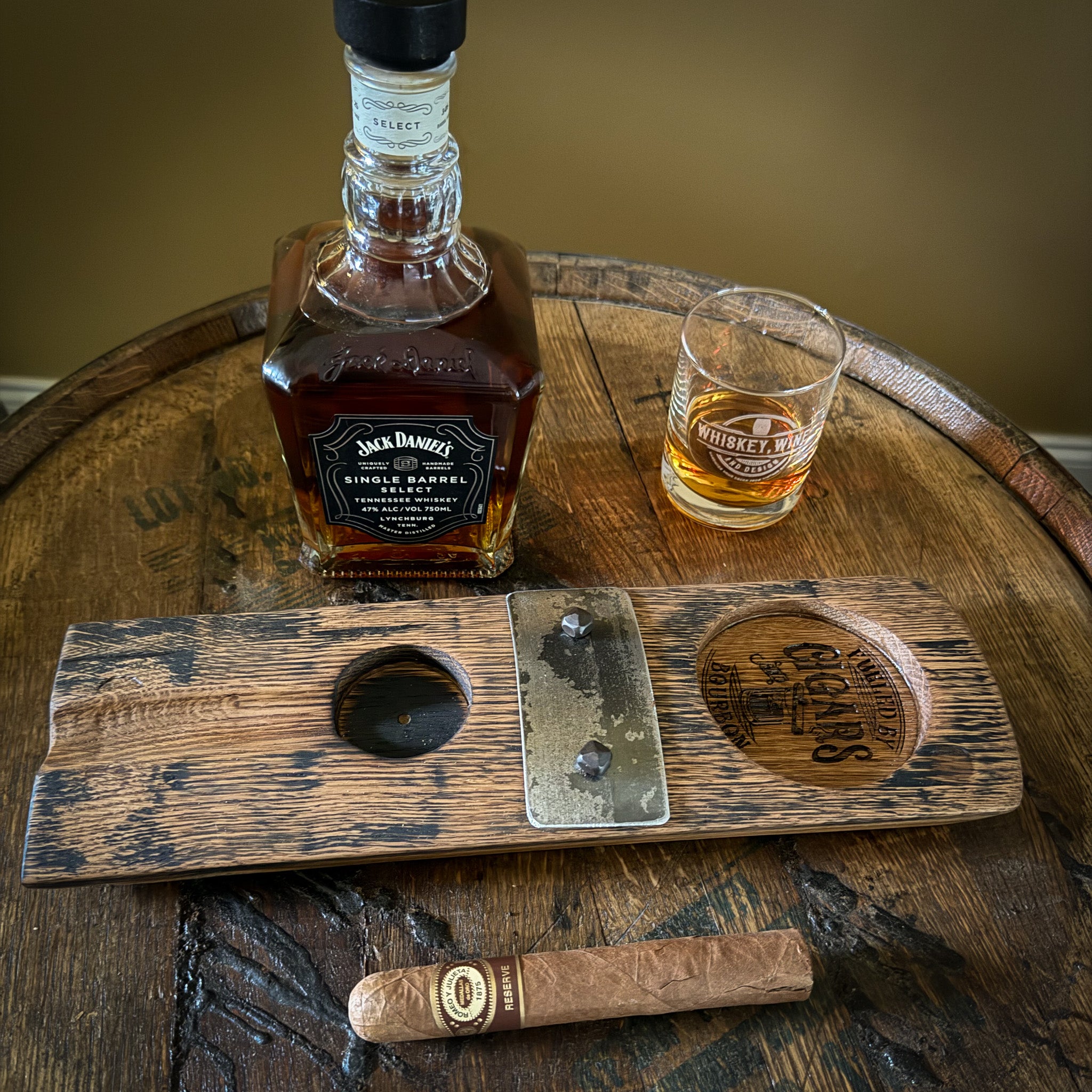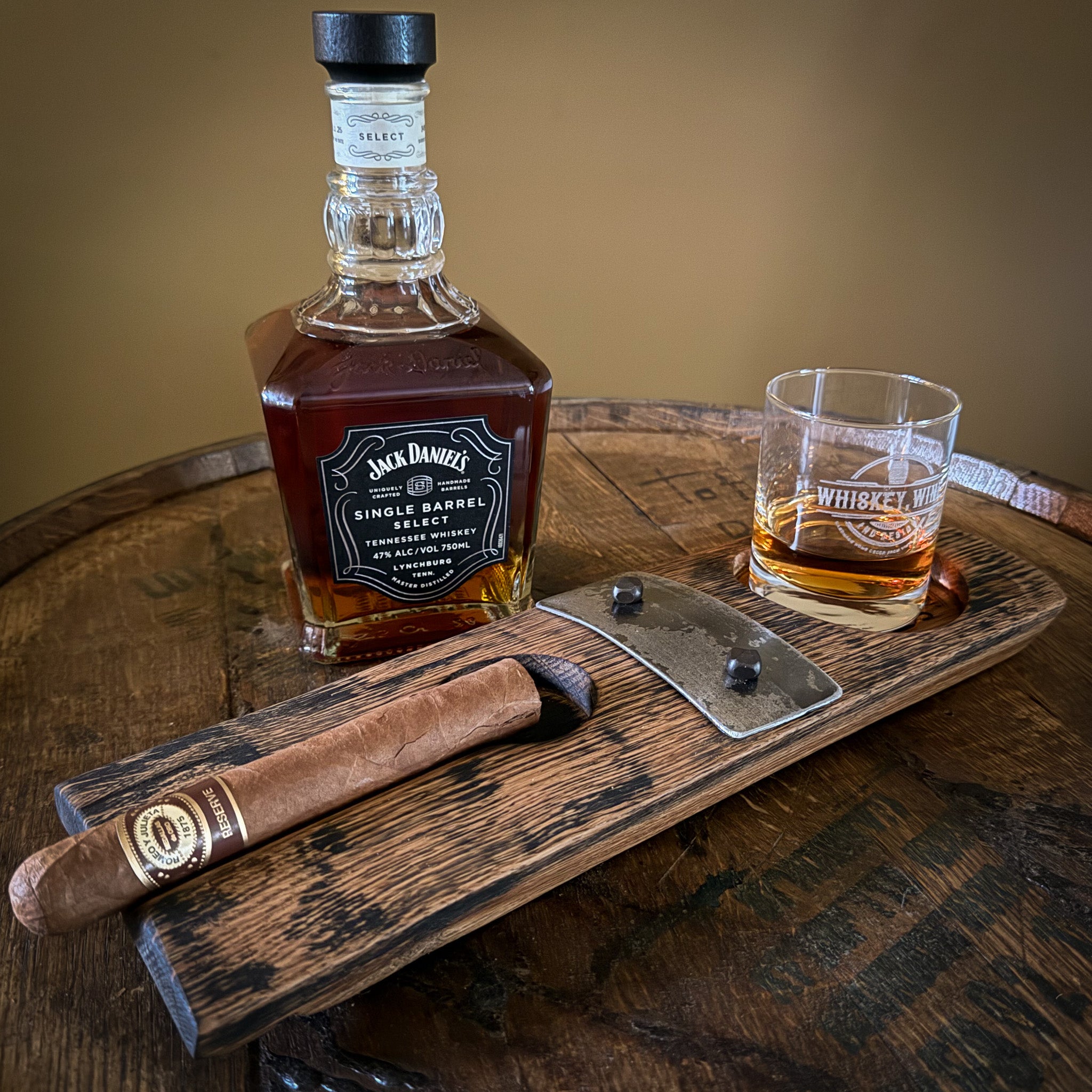 The STOGIE Cigar Throne: Our premier Stogie Cigar Throne uses nearly half of the barrel stave for a large cigar resting area leading into a large charred ashtray. It includes a 3.5" cup holder on top and features a portion of the authentic barrel hoop adorned with our signature blacksmith bolts.