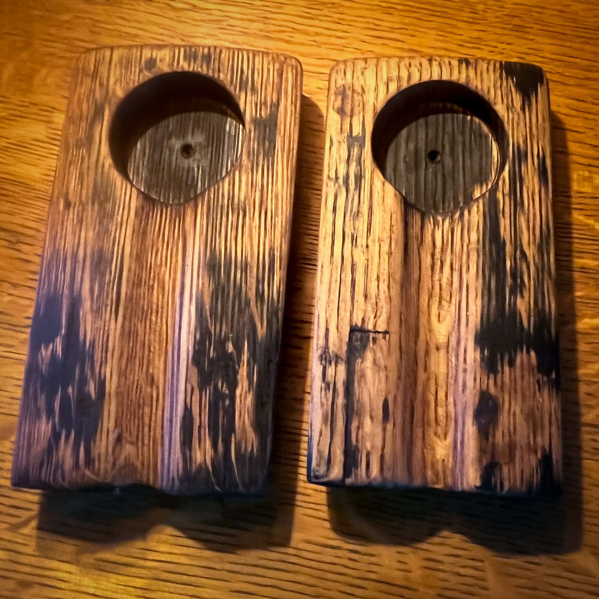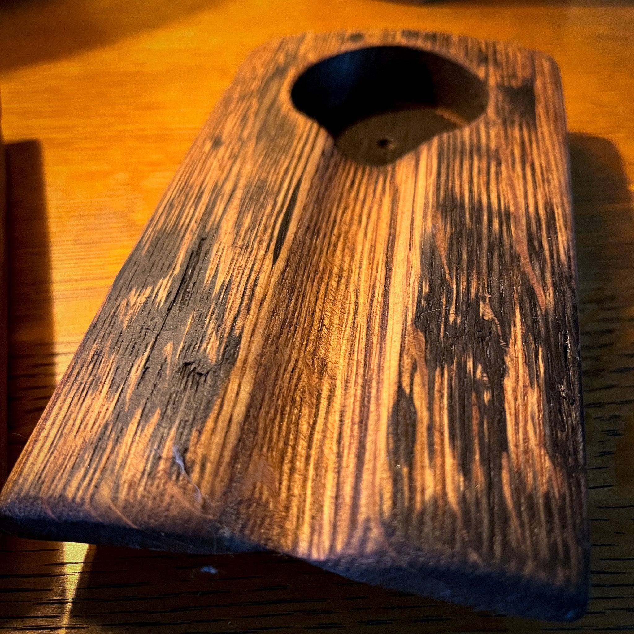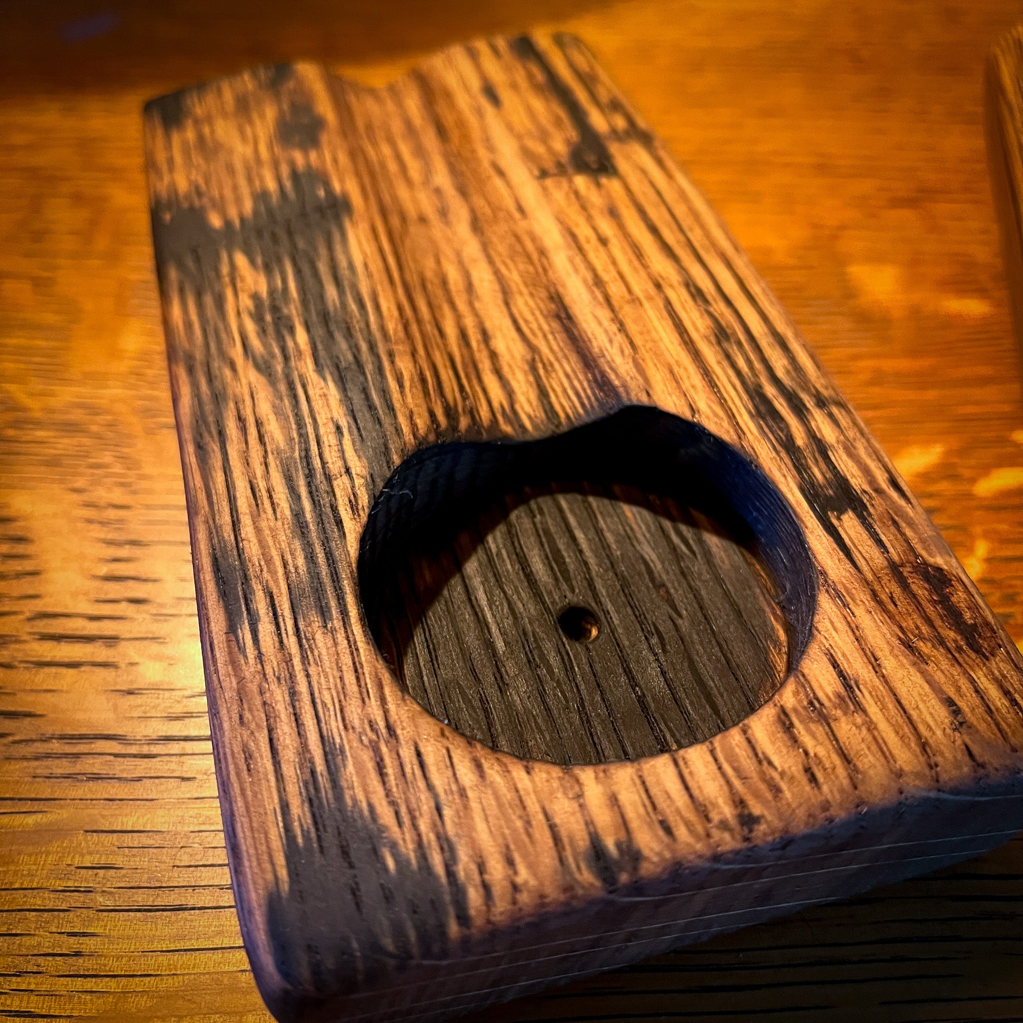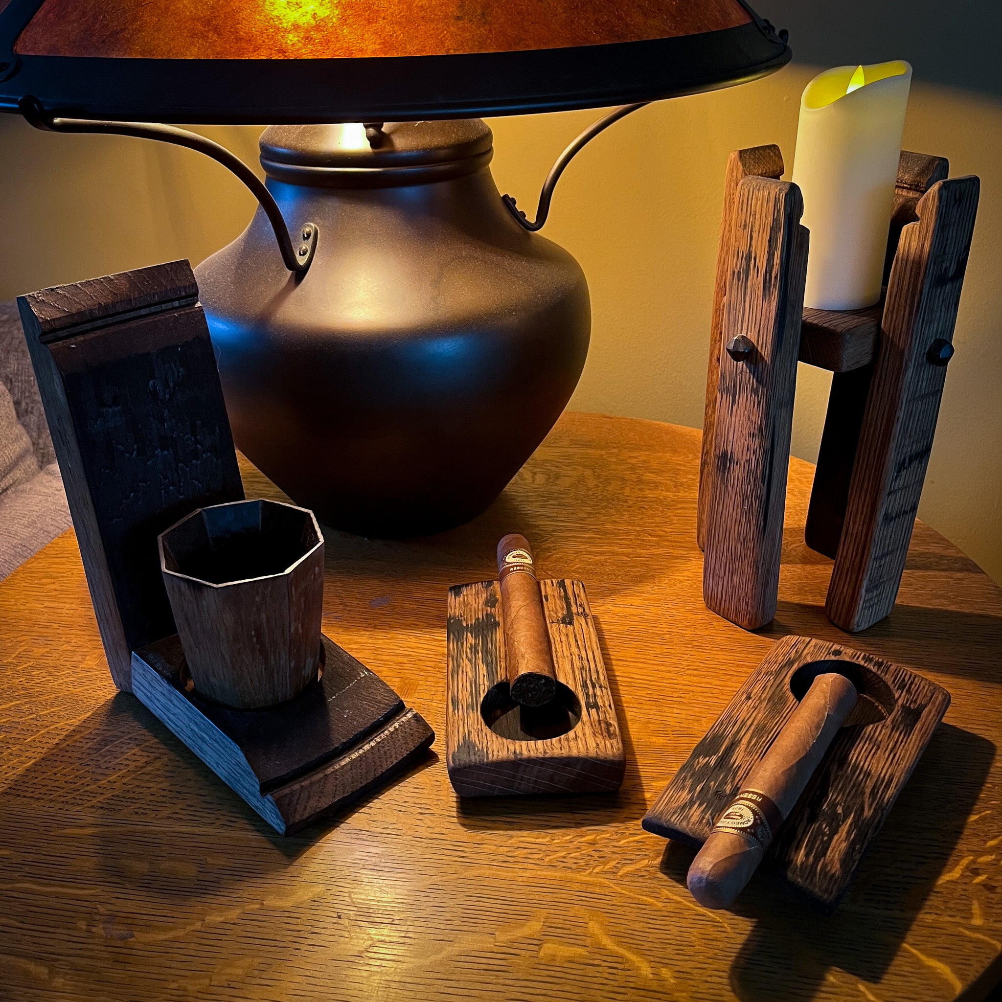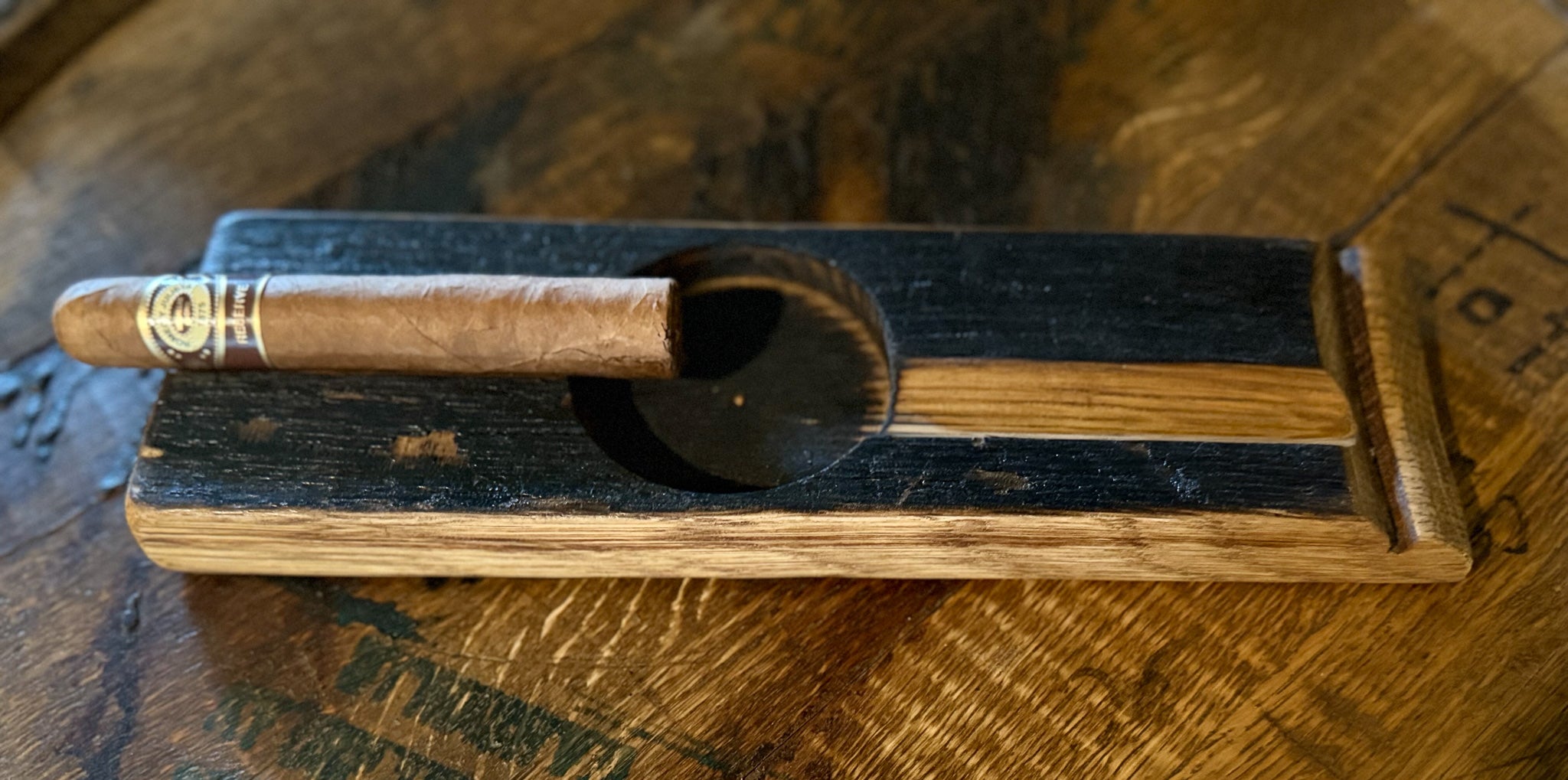 Single Ash Tray Throne: Carved from the barrel stave tip of a whiskey barrel, our single ash tray thrones are the perfect vessel to hold your burning stogie with the rustic appeal of a vintage barrel to boot.