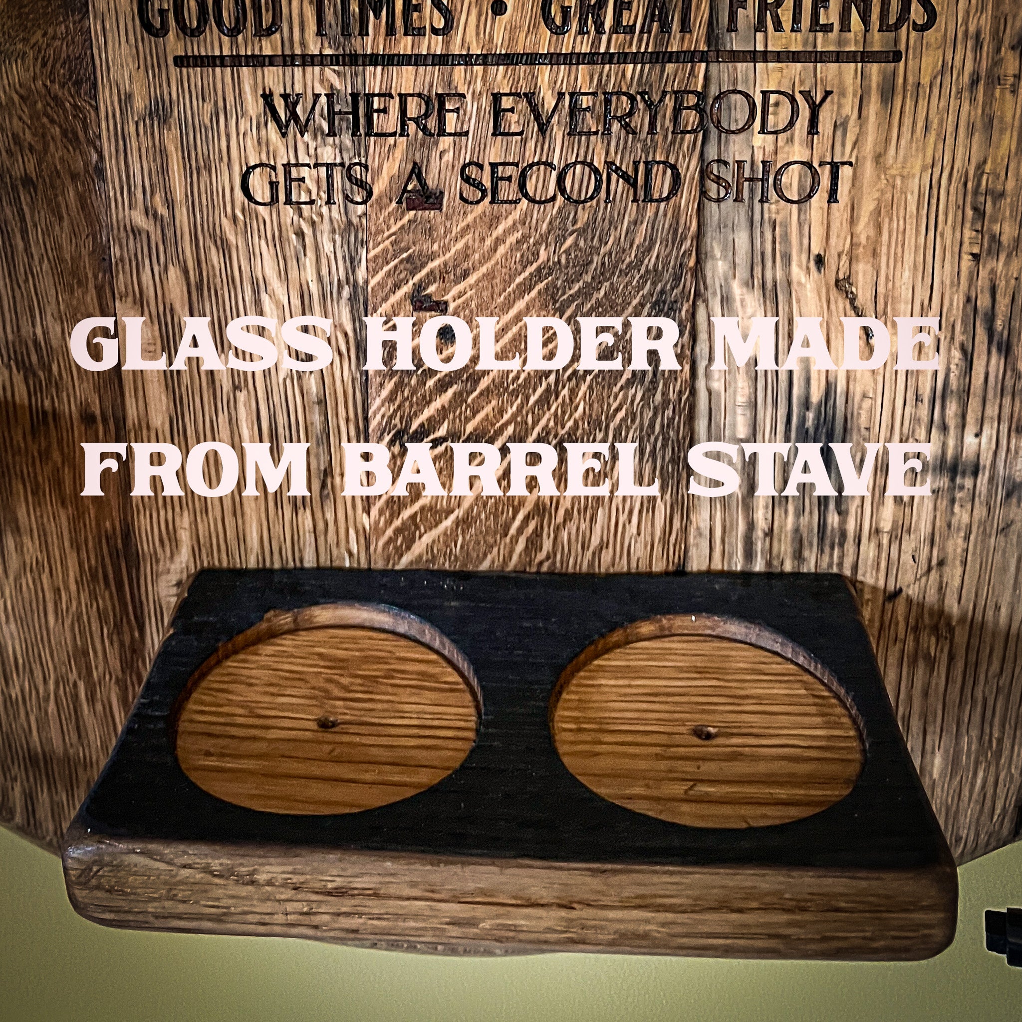 1. Rocks Glass Shelf: Made from a bourbon barrel stave, it holds two rocks glasses, which are included!