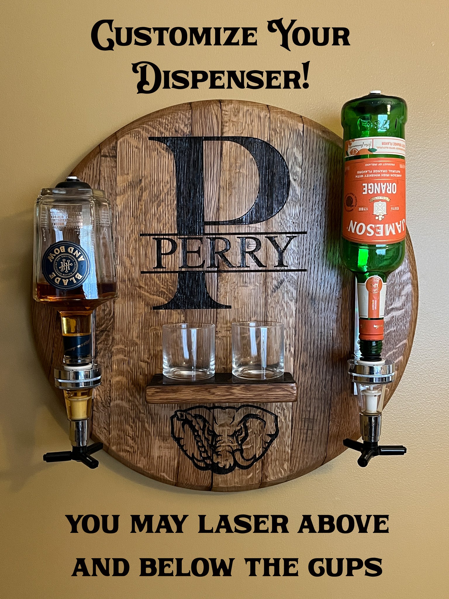 • STANDARD DESIGN: Includes two liquor dispensers on a bourbon barrel lid (liquor not included), a glass holder for two rocks glasses (included), the "Bourbon Bar" text with your name personalization. Price: $250 (includes shipping to the lower 48 states).