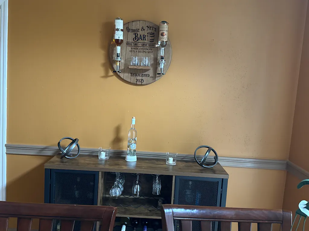 This is an original design by Whiskey, Wine and Design. Bring the authentic spirit of a bourbon barrel into your home bar with our wall-mounted liquor dispenser. This piece is handcrafted from a genuine, kiln-dried barrel lid, serving as both functional art and a stunning centerpiece. It comes ready for personalization and includes an integrated shelf with two rocks glasses to complete your bar setup.